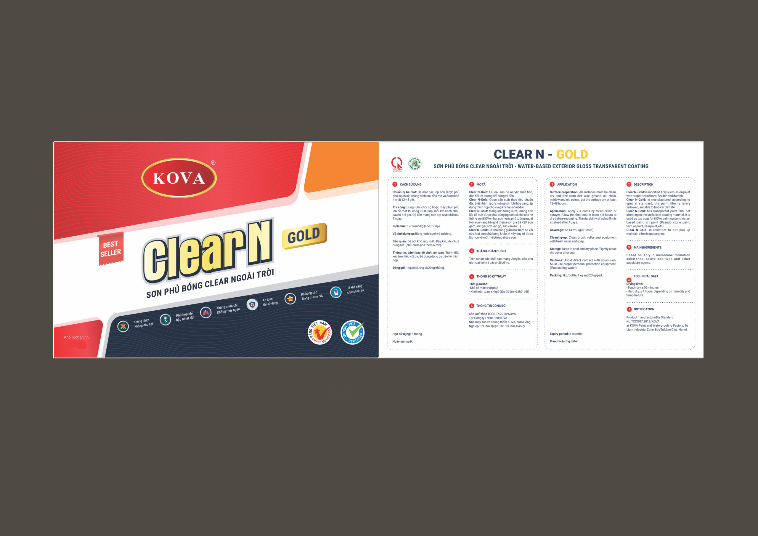 - Clear-Gold: Màng sơn trong suốt, không che lấp, giữ nguyên bề mặt của vật liệu được phủ, dùng để phủ lên các hệ thống sơn KOVA như: nước sơn, sơn nghệ thuật (sơn giả đá, sơn gấm, gai, sơn vân đá,…) do có độ bóng cao, khả năng co giãn tốt, chịu được tia cực tím..